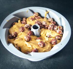 Eine Silikonform leicht fetten man braucht dies wohl nicht, ich fette sie aber zur Sicherheit lieber. Ein drittel Teig einfüllen und ein Drittel der Kirschen darauf verteilen, so fortfahren bis der Teig und die Kirschen in der Form sind.