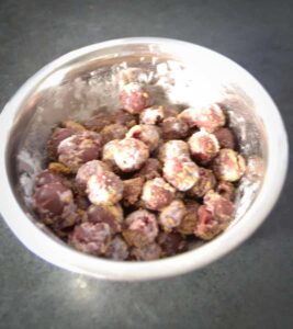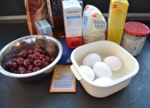 dann die Kirschen mit den Semmelbröseln vermischen damit sie sich im Teig besser verteilen und nicht auf den Boden der Form sacken.
