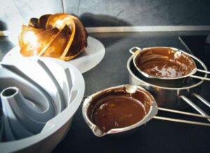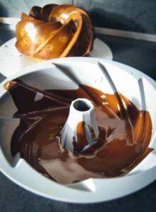 Silikonform gießen. Die Schokolade in der Form gut verteilen und die Form 3-3 mal aufstossen damit sich keine Luftblasen bilden