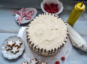 Sahne mit Sahnesteif schlagen, Frischkäse, Vanillezucker, etwas Zimt verrühren. Beides verrühren und in einen Spritzbeutel füllen. Die Hälfte der Torte mit Sahne tupfen, verzieren. Zimtsterne und kleine Lebkuchen-Plätzchen in die Torte stecken. Die gezuckerten Rosmarin Triebe auf die Schokoladentorte legen. Die Torte im Kühlschrank bis zum Servieren kühlen. Zuckerstangen erst vor dem Servieren auf die Torte legen.