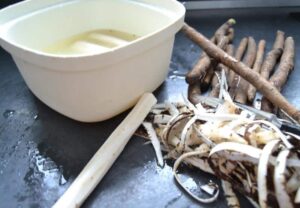 Die Schwarzwurzel Stücke sofort in die Milch legen, da sie sehr schnell braun werden! Die Milch vor dem Kochen dann mit Wasser mischen