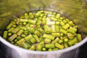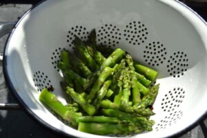 Nun die kleinen grünen Spargel Stücke in gut gesalzenem kochendem Wasser 2 Minuten blanchieren und mit einem Schöpflöffel in eiskaltes Wasser geben. Damit die grüne Farbe erhalten bleibt.