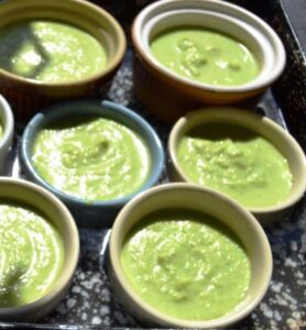 Die Spargel Masse in Förmchen gießen und diese in eine mit Wasser gefüllte Form setzen den Flan nun im Wasserbad im vorgeheiztem Backofen bei 180 Grad ca. 20 Minuten garen. Je nach Größe der Form bekommt man bis zu 7 kleine Flan.