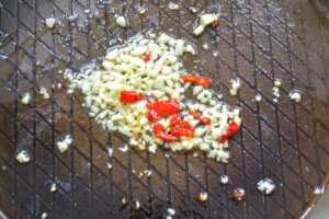 In einer großen hohen Pfanne etwas Butterschmalz erhitzen und Chili und Knoblauch 2 min dünsten.