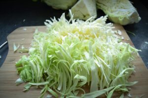 Die Spitzkohl viertel vom dicken Ende zur schmalen Spitze in dünne feine Streifen schneiden. Danach den Kohl waschen und gründlich abtropfen lassen.