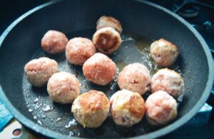 Etwas Butterschmalz oder Rapsöl in einer Pfanne erhitzen und die Mettbällchen von allen Seiten 10 min. anbraten.