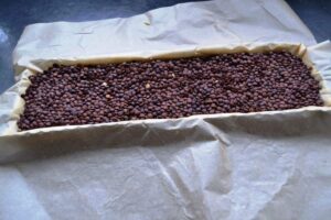 nun das Backpapier auf den Teig legen und Linsen oder andere Hülsenfrüchte in die Form füllen. Den Tarteboden im vorgeheiztem Backofen bei 180 Grad ca. 15 Minuten backen. Vorsichtig das Backpapier mit den Linsen entfernen und den Boden noch 3 -4 Minuten backen, dass er etwas Farbe bekommt
