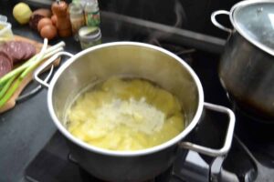 die Kartoffelscheiben im kochenden Wasser ca. 5 Minuten kochen