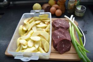 Gericht: Backen, Gut vorbereiten, Hauptspeise, herzhafter Kuchen, Kartoffeln, Obst, Schwein