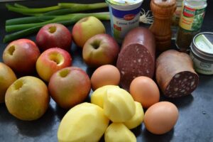 Diese Füllung der leckeren französischen Tarte mit Blutwurst, Kartoffeln, Äpfeln und Zwiebeln kennen wir in Westfalen auch etwas anders als Himmel und Erde