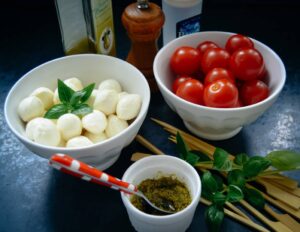 Leckeres Fingerfood, die kleinen Tomate Mozzarella Sticks sind sehr schnell zubereitet. Die Tomaten und Mozzarella Kugeln werden mit Basilikum Blättern aufgespießt. Dann werden die Tomaten-Mozzarella-Spieße in ein Glas gestellt und mit etwas Pesto und Öl mariniert. Die leckere Antipasti ist in 10 Min. zubereitet.
