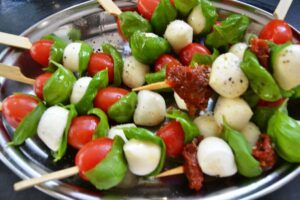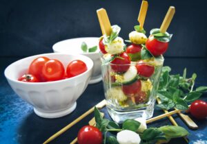 Die Spieße in ein kleines Glas stellen. Ein paar Spieße habe ich statt mit frischen Tomaten mit eingelegten Tomaten zubereitet, was auch sehr lecker ist.