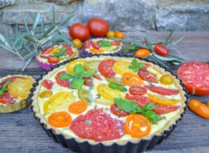Französische Tomaten Quiche mit Ziegenkäse, die leckere Tomatentarte wird mit verschiedenen bunten Tomatensorten und einem Frischkäse Guss mit Ziegenkäse, Rosmarin und Thymian gebacken. Für das Quiche-Rezept wird der herzhafte Quicheboden aus einem Mürbeteig mit etwas geriebenen Käse vorgebacken.