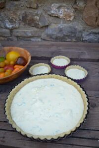 Den Ziegenkäse Guss auf den blind vor gebackenen Tarteboden gießen