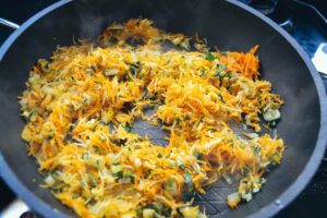 Möhre und Sellerie raspeln, Knoblauch klein hacken, die Zwiebel fein würfeln und die Petersilie klein schneiden, etwas Rapsöl erhitzen und das geraspelte Gemüse,