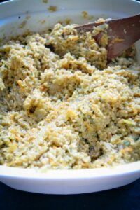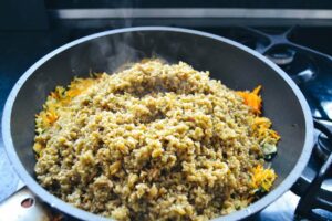 Den gekochten Grünkern dazu geben und alles gut vermengen und zusammen 3-4 Minuten dünsten.