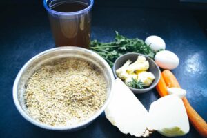 Alle Zutaten bereitstellen, den Grünkern grob schroten und im Gemüsefond ca.20 Minuten auf kleiner Flamme kochen.
