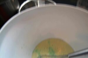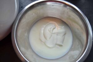 den Joghurt und den Zucker in die etwas abgekühlte Waldmeister Sahne rühren, sie sollte wegen der Gelatine noch lauwarm sein.