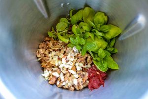 Die gerösteten Walnüsse, Basilikum, Knoblauch und Tomatenmark mit dem Olivenöl in die Küchenmaschine oder in einen Standmixer geben
