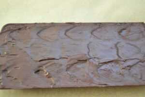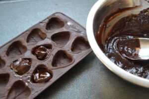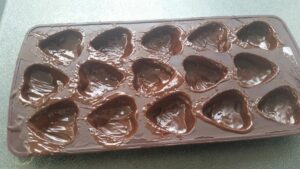 bis die Schokolade fest ist. Den Vorgang wiederholen und die Form ein zweites Mal mit Schokolade ausstreichen und danach kopfüber in einer Schüssel aus tropfen lassen. Die mit Schokolade ausgestrichene Form für ca. 20-30 Minuten im Kühl oder Eisschrank kühlen.
