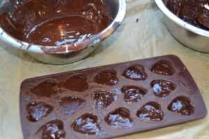 Die dunkle Schokolade breche in Stücke. Erwärme etwas Wasser in einem kleinen Topf und stelle eine kleine Metallschüssel mit den Schokoladenstückchen hinein. Wenn die Schokolade langsam schmilzt, rühre sie vorsichtig um. Mit einem Backpinsel streiche die flüssige Schokolade dünn in eine Silikonform. Sehr gut eignet sich dafür eine Eiswürfel-Silikonform (z. B. Herzen) Die Form im Kühlschrank kühlen,