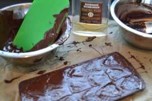 Den Baileys mit der Sahne und dem Whiskey mischen und die 60 % Schokolade es sollte eine gute Vollmilchschokolade sein, in der Likör-Flüssigkeit schmelzen. Am besten geht dies in einer kleinen Metallschüssel, die man wieder in ein heißes Wasserbad stellt.