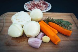 Die Möhre, Sellerie, Zwiebel, Knoblauch und Schalotte schälen