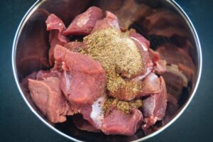 Den Wildgulasch mit dem Wildgewürz großzügig einreiben und vermischen