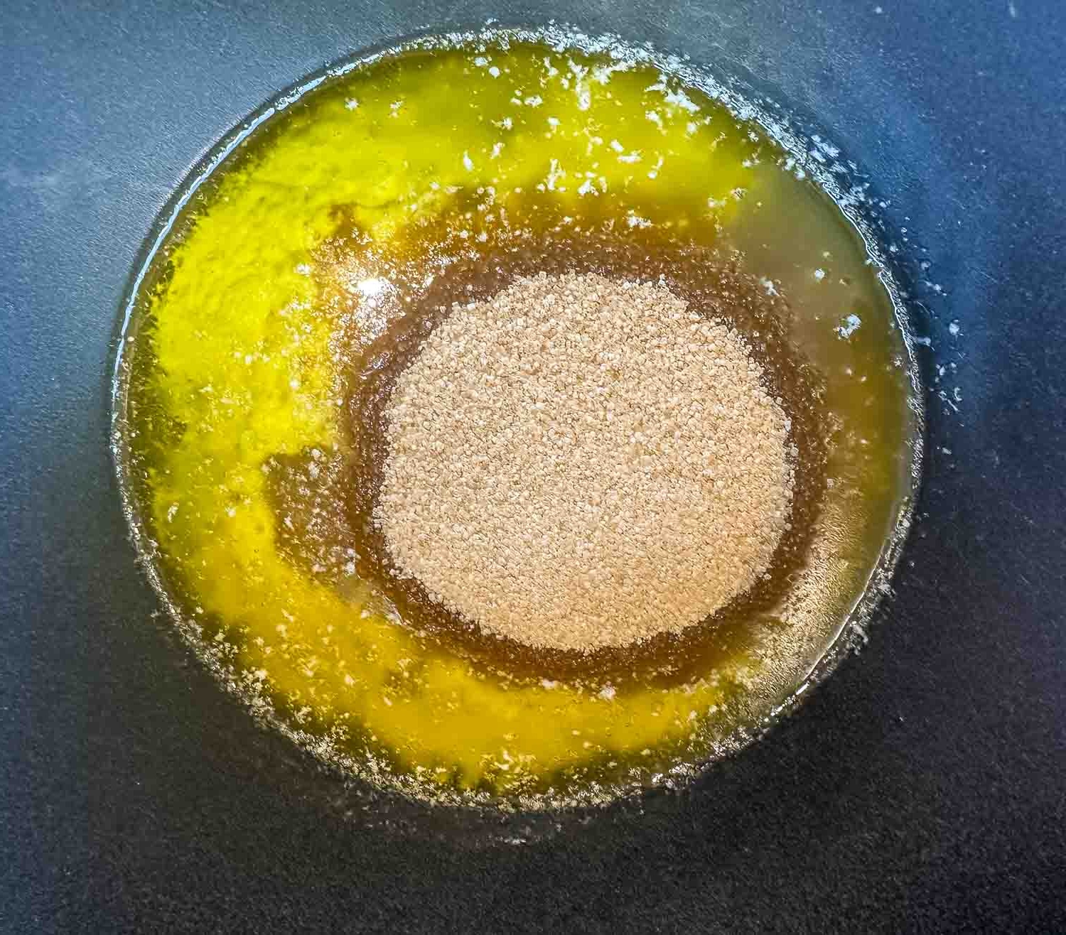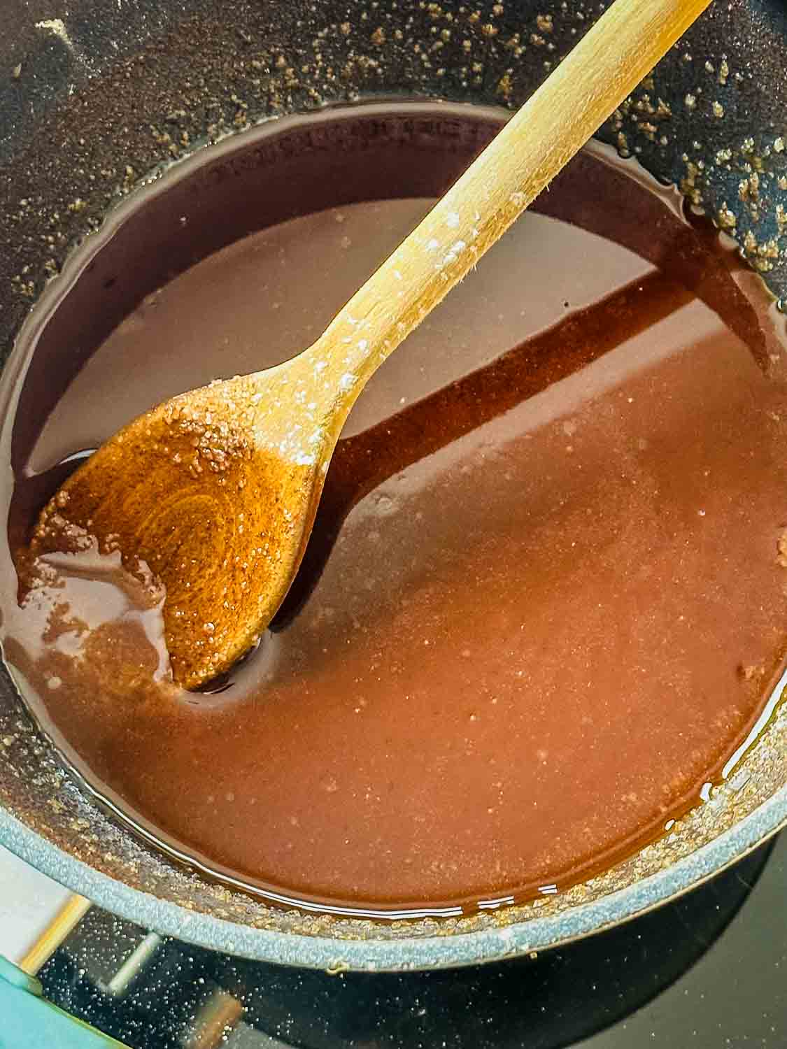 - Schmelze die Butter kurz in einer Pfanne, rühre den braunen Zucker, Zimt und die Speisestärke darunter.