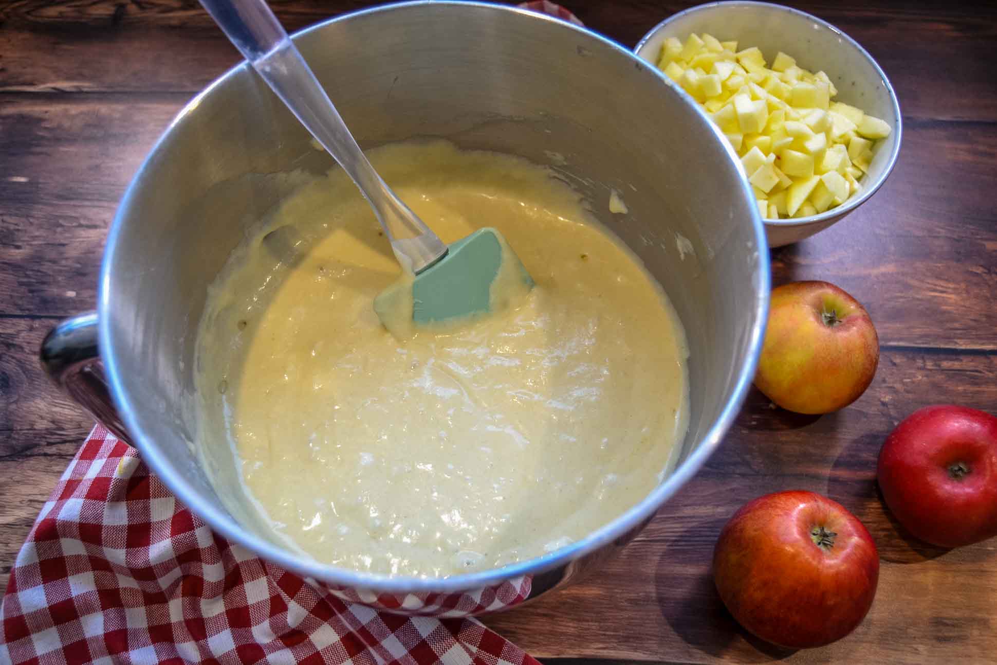 Die Äpfel werden klein gewürfelt, damit sie beim Backen gleichmäßig durchgaren und schön weich werden. So verteilen sie sich im Teig gut, geben gleichmäßig Saft ab und sorgen dafür, dass der Kuchen saftig bleibt und die Apfelstücke beim Essen nicht zu hart sind.